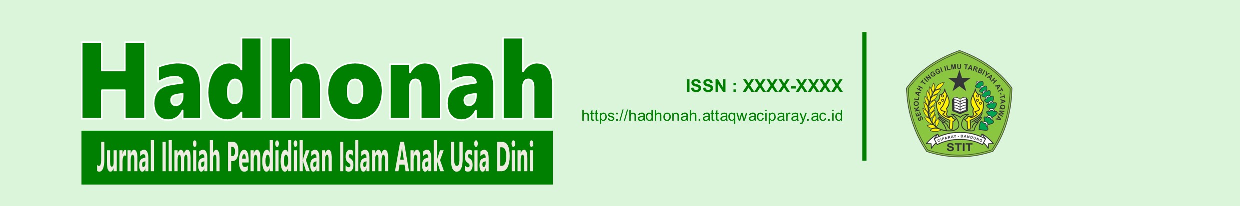 Hadhonah adalah Jurnal Ilmiah Pendidikan Islam Anak Usia Dini yang diterbitkan oleh Sekolah Tinggi Ilmu Tarbiyah (STIT) At-Taqwa Ciparay Bandung. Jurnal ini fokus pada publikasi hasil penelitian dan pemikiran pendidikan Islam anak usia dini oleh para dosen, guru mahasiswa, dan para peneliti. Adapun cakupan dan lingkup jurnal Hadhonah meliputi :